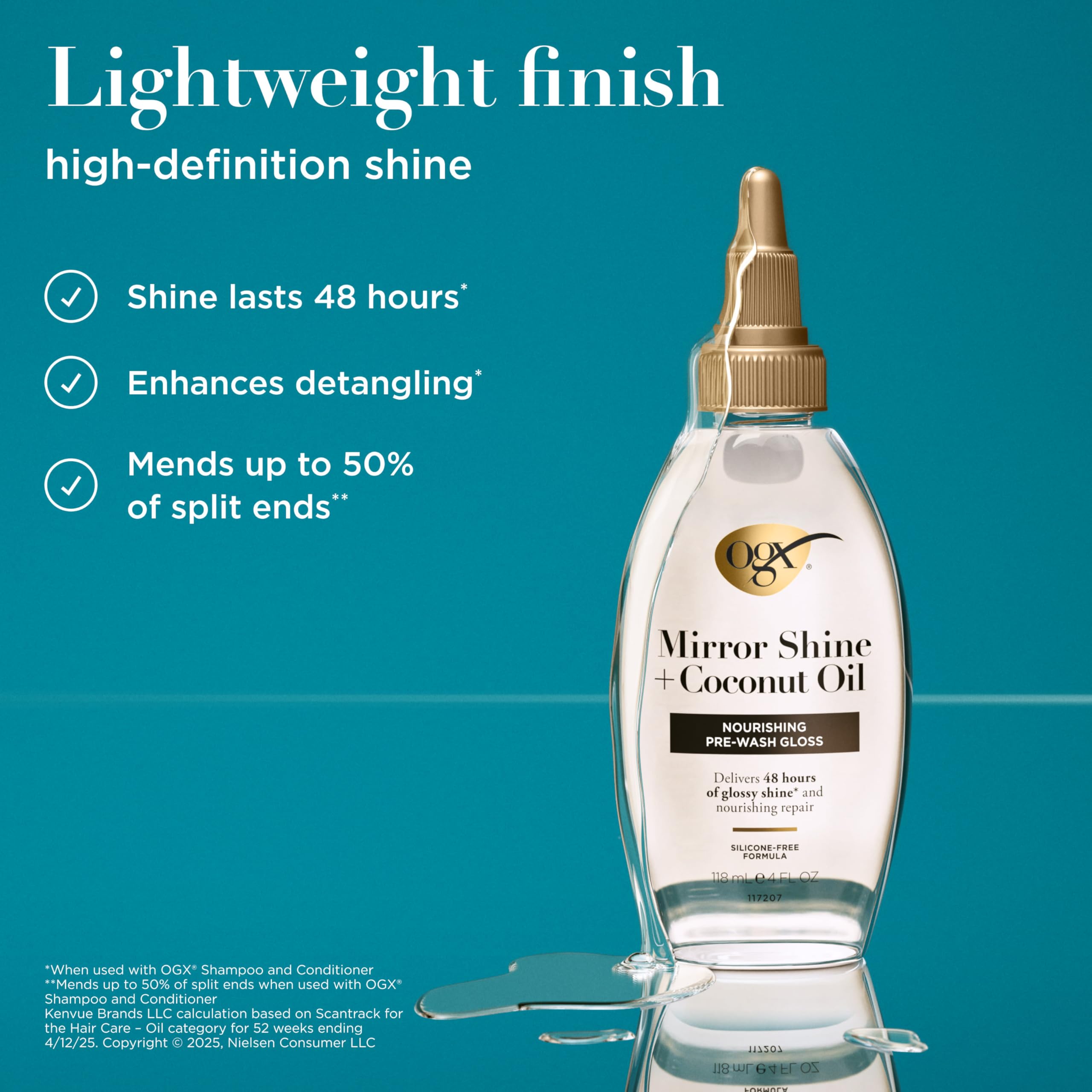 - NOURISHING PRE-WASH GLOSS: 4-fluid ounces of OGX Mirror Shine + Coconut Oil Nourishing Pre-Wash Gloss for dry, damaged hair to deliver silky, shiny hair